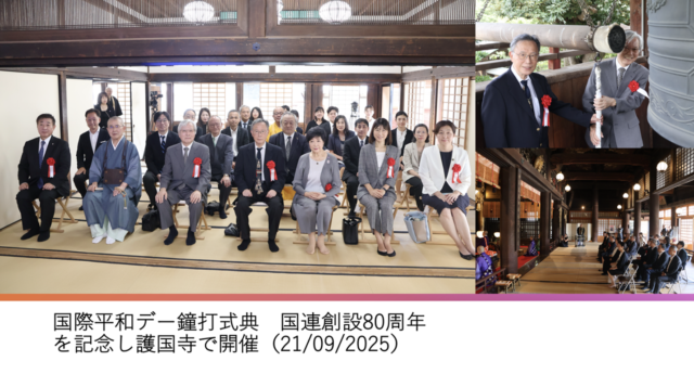 今年の式典は、国連創設80周年を記念する行事として特別な意義を持ち、参加者にとって平和の尊さを改めて胸に刻む機会となった。護国寺に響いた鐘の音は、日本から世界へと平和への願いを発信する象徴となった。