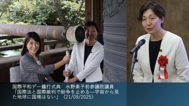 来賓挨拶に立った水野素子前参議院議員は、7月の参院選には不出馬で、現在は長谷川・谷本両氏のもとで国連・平和に関する指導を受けていると説明。JAXAで18年勤務し、ライデン大学で国際法修士を取得、国連の宇宙空間平和利用委員会に参加してきた経歴を述べた。