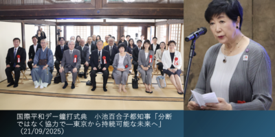 国際平和デー鐘打式典 小池百合子都知事「分断ではなく協力で—東京から持続可能な未来へ」(21/09/2025)
