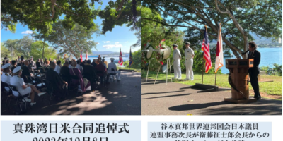 M. TANIMOTO Masakuni délivre un message spécial de M. ETO Seishiro, président du comité parlementaire de la Diète nationale du Japon, lors de la cérémonie commémorative conjointe Japon-États-Unis à Pearl Harbor le 8 décembre 2023. Veuillez cliquer ici pour plus de détails.(09/12//2023)