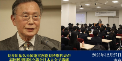 元国連事務総長特別代表の長谷川祐弘教授が2023年12月27日に東京の両国KFCホールで開催された模擬国連会議全日本大会で講演された。日本全国から参加された200人以上の学生が国際社会の平和と人間の尊厳を守るために、どのようにしてリーダーシップを発揮していく「志」を養っていくべきか説いた。詳細はここをクリックして下さい。(27/1/2/2023)