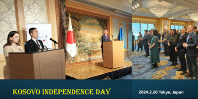 日本国際平和構築協会(GPAJ)理事でコソボ 大使の特別補佐官のアルベニータ・ソパージ氏とGPAJ会員の池上慶徳氏がコソボ大使館主催のコソボ独立16年ならびにコソボ共和国と日本の外交樹立15周年を祝う式典の司会を務めました。コソボ共和国のサブリ・キチマリ大使は、この2024年2月20日に東京のホテルオークラで開催されたレセプションに参加した日本政府の外交官や関係者らに挨拶した。(20/2/2024)